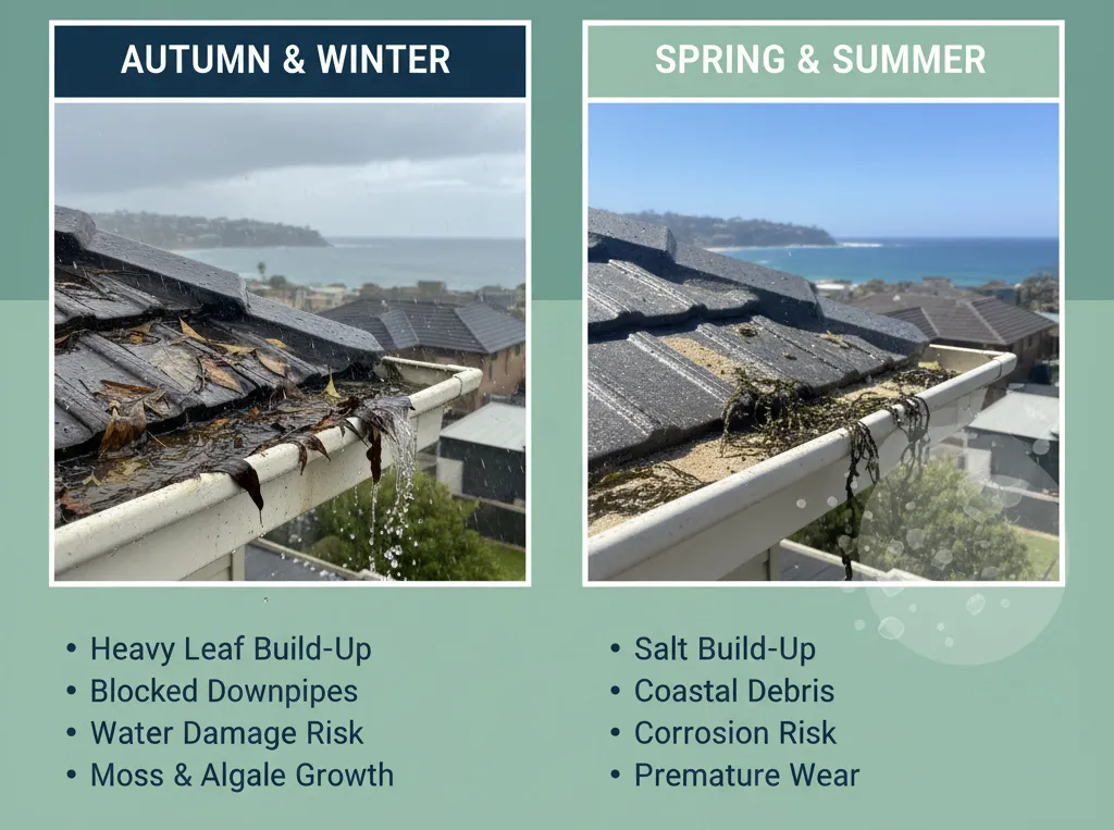 - Bushfire season: Dry debris in gutters becomes a real hazard during hot weather.